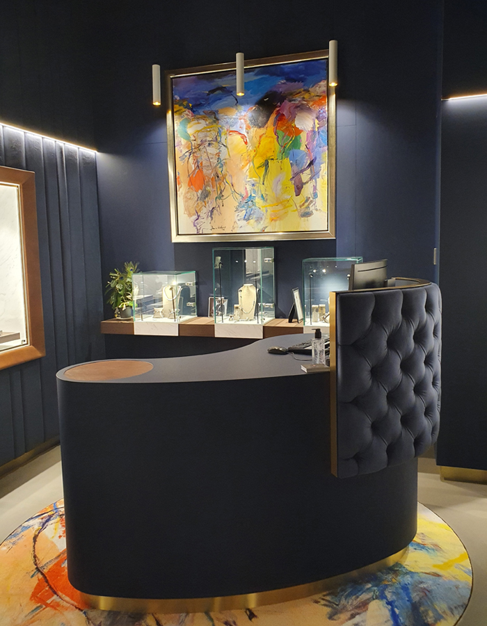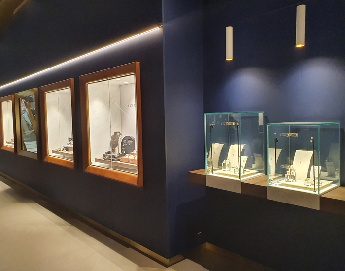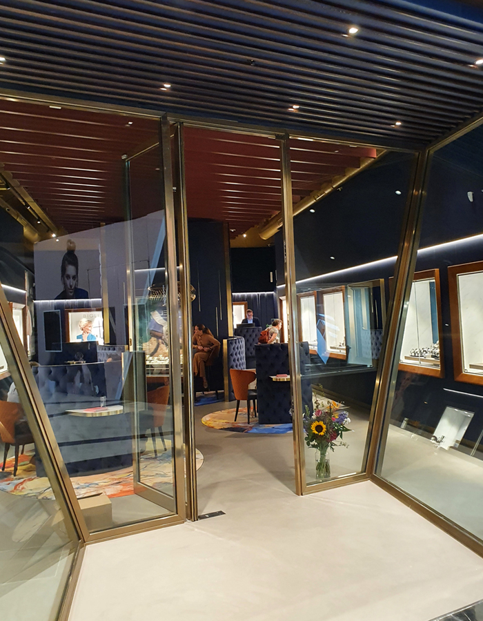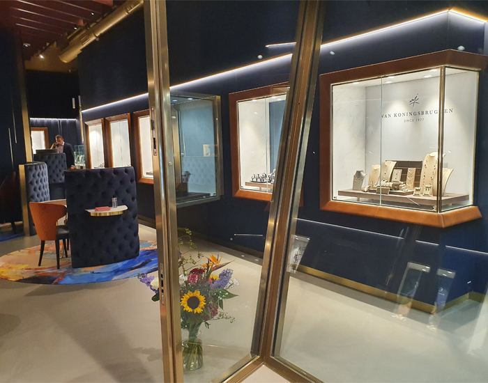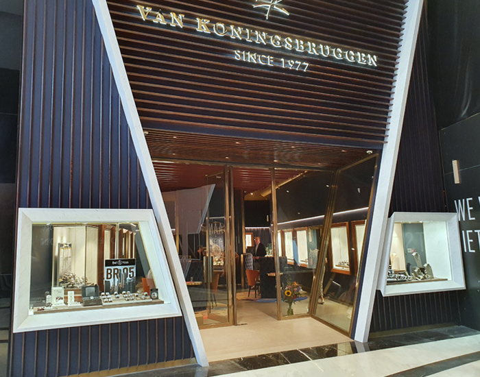 Juwelier Van Koningsbruggen heeft een nieuwe zaak geopende in de Mall of the Netherlands te Leidschendam. Wij hebben ze mogen helpen het interieur de luxe en warme uitstraling te geven die het nu heeft. De bronzen en messing afwerkingen in dit interieur zijn echt the finishing touch.