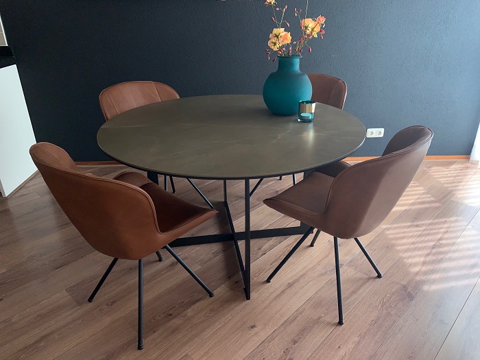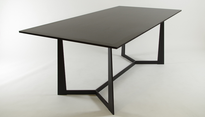 De Delta tafels bestaan uit een massief stalen frame van 8 of 10mm dik met een massief eikenhouten blad van 20 of 30mm dik met een verjongde rand of met een keramiek blad.