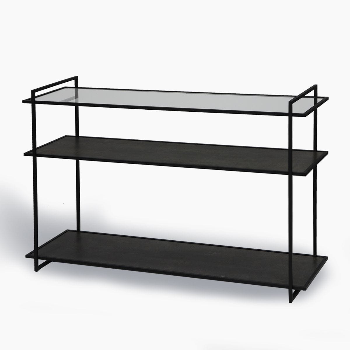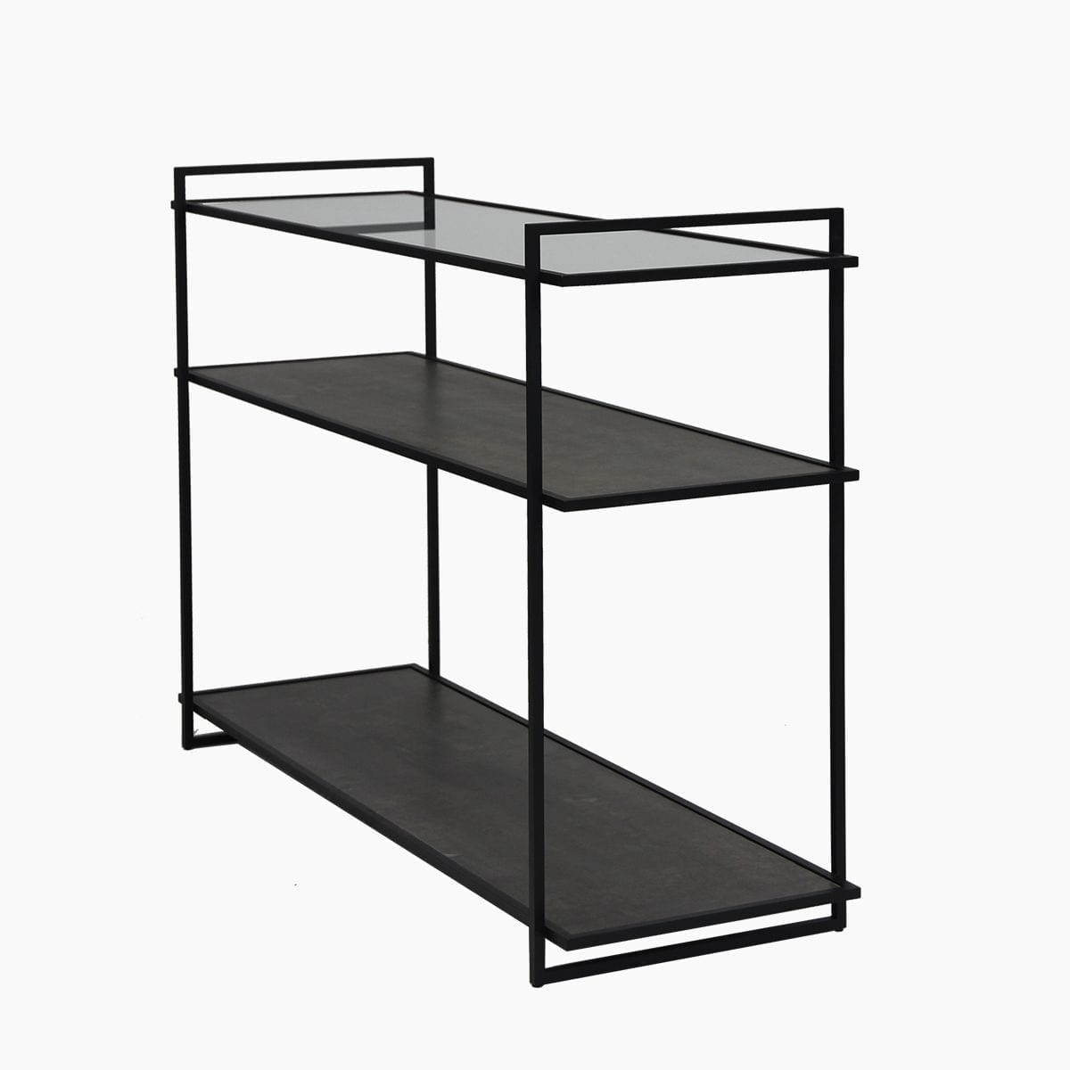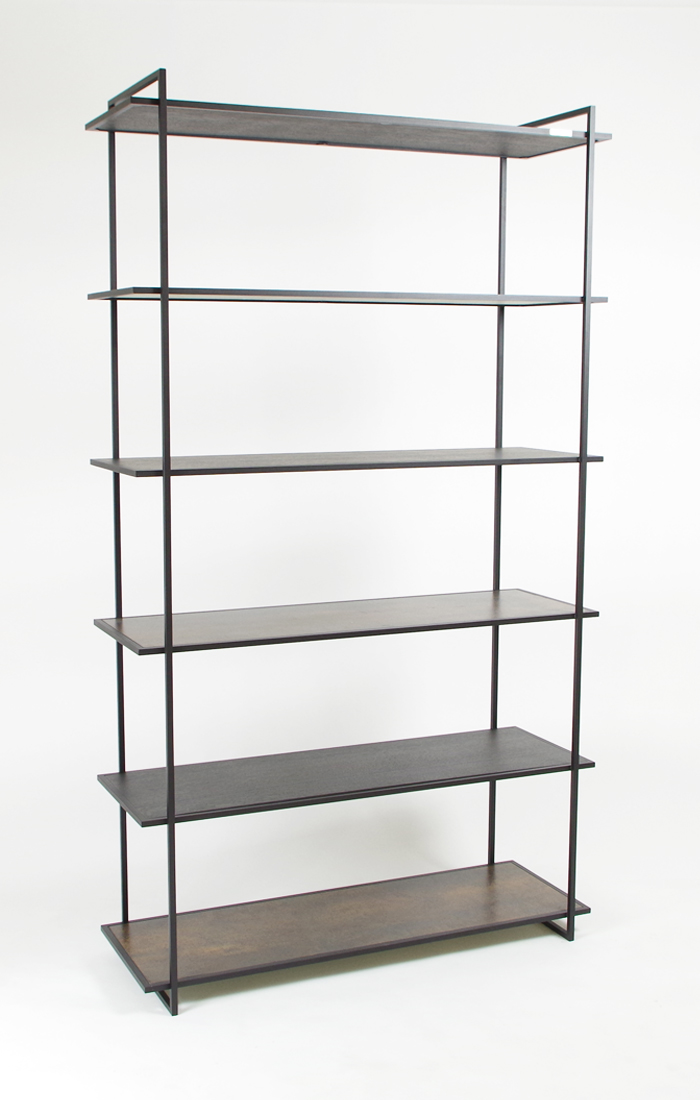 Wandtafel 120x37x81cm met 3 legborden. Wandrek 101x36x175cm met 6 legborden.