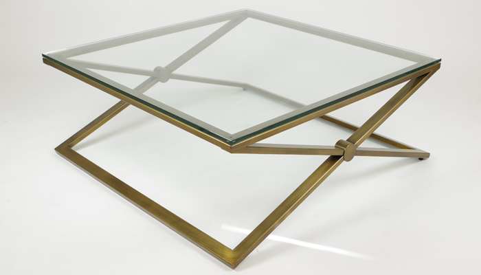 Het frame van de Cross tafel wordt uitgevoerd in gebruineerd messing, old steel of in een andere gewenste kleur.Het glasblad is 12mm dik of 20mm dik eiken.